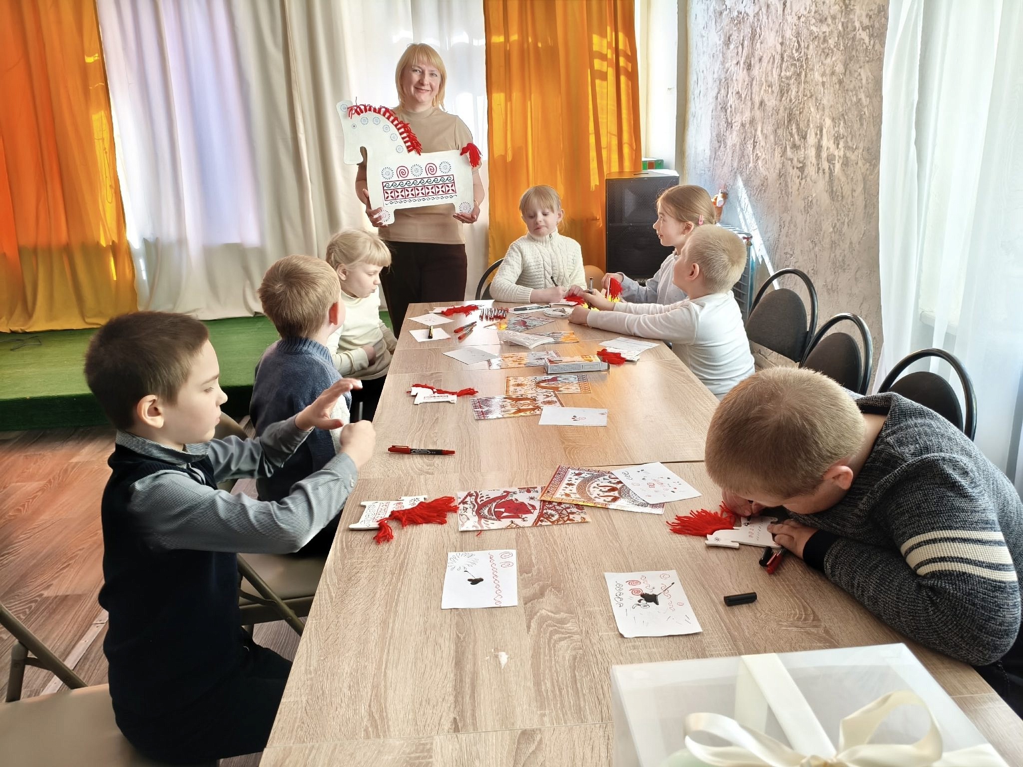 Конь в мезенской росписи олицетворяет солнце, энергию и жизненную силу, а его изображение наполнено гармонией и глубоким смыслом. Конь символизирует богатство семейного очага, большую и дружную семью, семейное счастье. На мастер-классе дети сами создавали орнаменты и рисовали узор. У каждого получился замечательный «ИГО-ГО»